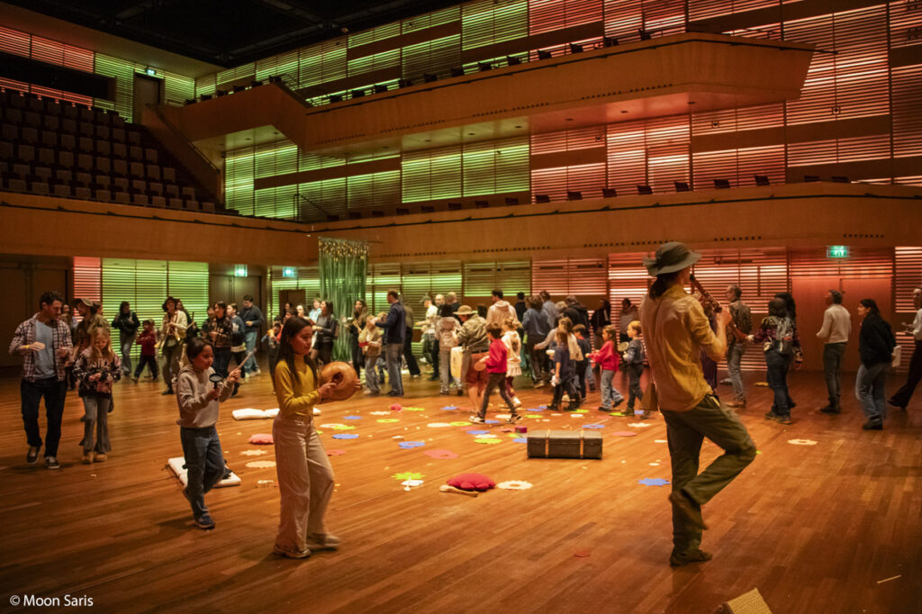 The proposal invites all the family members to explore the world around them with their own senses and in relation to others. In that way the piece would aim to show the contrast of real experience versus virtual experience, which is so naturalized nowadays. Music — as an universal language — will be the tool used to create an experience in which body sensoriality and collectivism will allow participants to have a different approach to everyday reality.